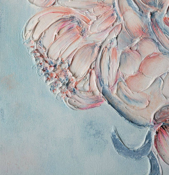 Dans cette première oeuvre florale, l'artiste désire insuffler de la délicatesse, de la transparence et de la douceur. Asimo applique des jeux de lumières et d'ombres aux pivoines ainsi que de la texture 3D pour permettre une immergence complète à l'oeuvre.